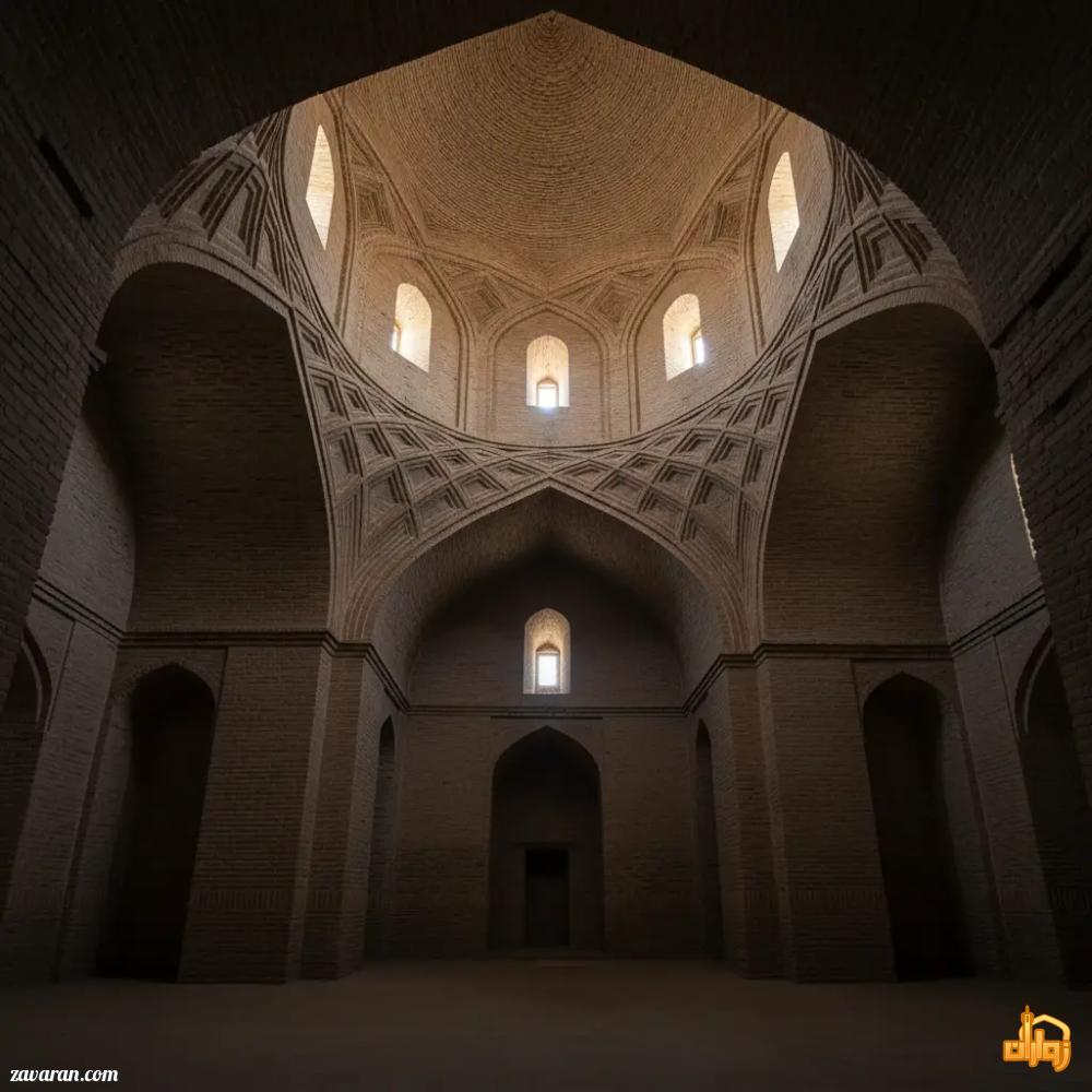 پلان بنا چهارگوش (مربع) است که نمادی از استواری و ثبات در معماری سنتی ایران به شمار میرود. فضای داخلی شامل یک ورودی ایواندار بلند، چهار شاهنشین، گنبدخانهای عظیم و اتاقهایی در پیرامون است که احتمالا کاربرد خاص خود را داشتهاند. گنبد بنا به صورت دوپوش اجرا شده است؛ اگرچه پوشش خارجی آن در گذر زمان فرو ریخته یا شاید هرگز تکمیل نشده، اما پوشش داخلی همچنان استوار و پابرجاست. مقرنسکاریهای گچی و خطوط معماری که چشم را به سمت سقف هدایت میکنند، فضایی روحانی و خاص در داخل بنا ایجاد کردهاند که برای عکاسی و تامل، بینظیر است.
